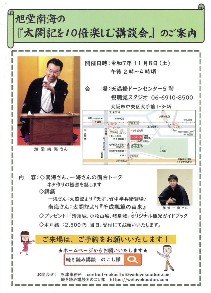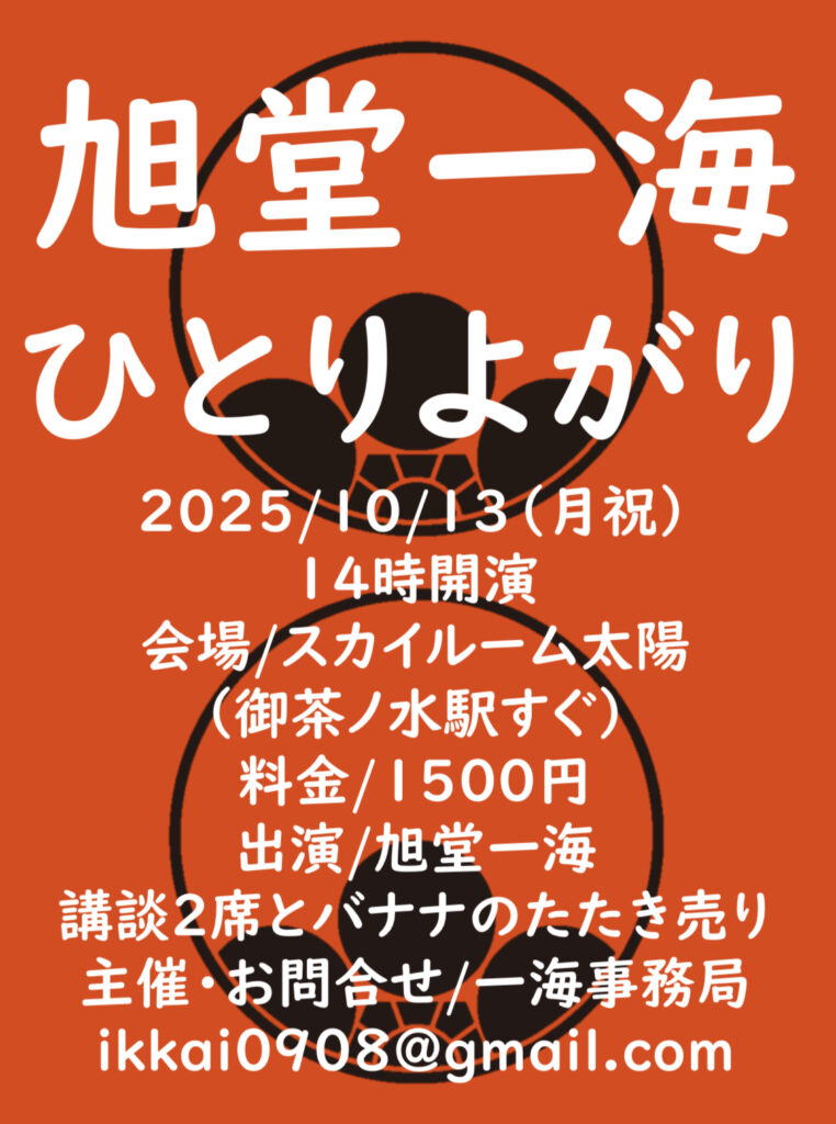 予約・問合せ 旭堂一海事務局 080-6240-1147 ikkai0908@gmail.com