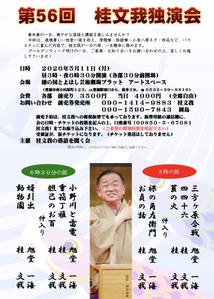 ご予約・お問合せ:桂文我 090-1414-9883 岡島 090-1590-7843